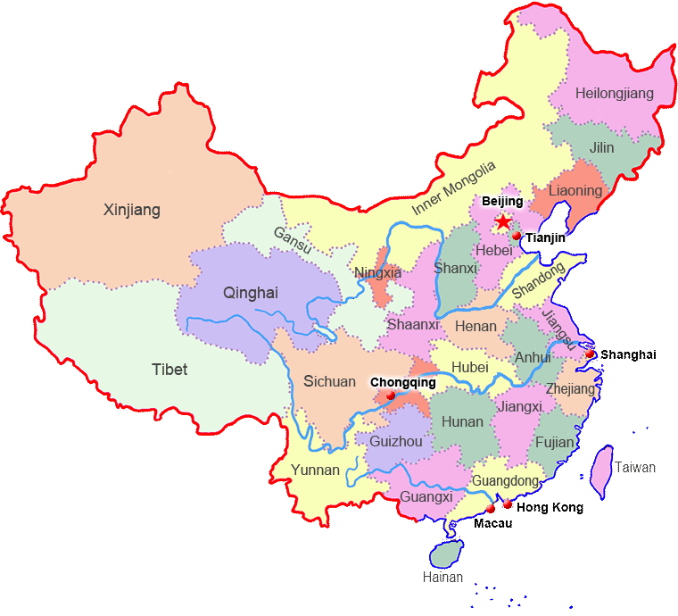 Twenty-three provinces: Hebei, Shanxi, Liaoning, Jilin, Heilongjiang, Shaanxi, Gansu, Qinghai, Shandong, Jiangsu, Zhejiang, Anhui, Jiangxi, Fujian, Taiwan, Henan, Hubei, Hunan, Guangdong, Sichuan, Guizhou, Yunnan, Hainan